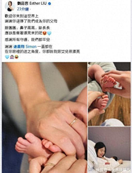 刘品言昨天在社交平台贴出女儿的照片,说她当妈妈了,她写,欢迎你来这个世界,谢谢你选我们当爸妈,孩子脸圆圆的,鼻子挺挺的,脚丫子也长得快,丈夫连晨翔在评论里回,从第一眼见到你,我就成了你头号粉丝,两人的话没多华丽,可不少人看了心里一暖。